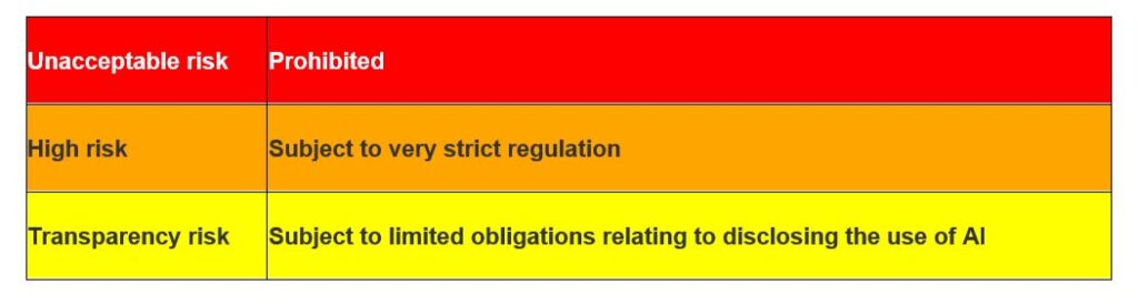 The AI Act puts in place new compliance rules for certain AI systems and models. It classifies AI systems into three categories, based on their level of risk, and the level of compliance obligations flows from that classification.